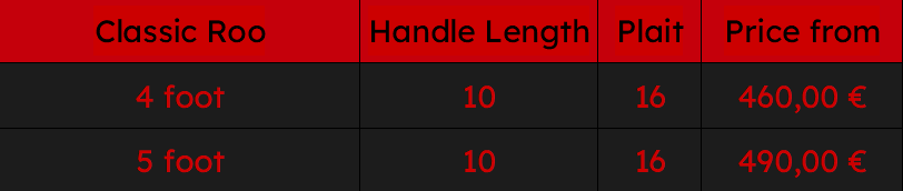 The Classic series has two braided kangaroo leather bellies and at least one bolster which varies depending on the whip length. For shorter whips (4-6ft) soft chrome split leather is used. For longer whips, use somewhat stiffer leather such as vegetable-tanned cowhide or kangaroo leather. The whip ends with a 6-8 point fall hitch and a redhide fall.